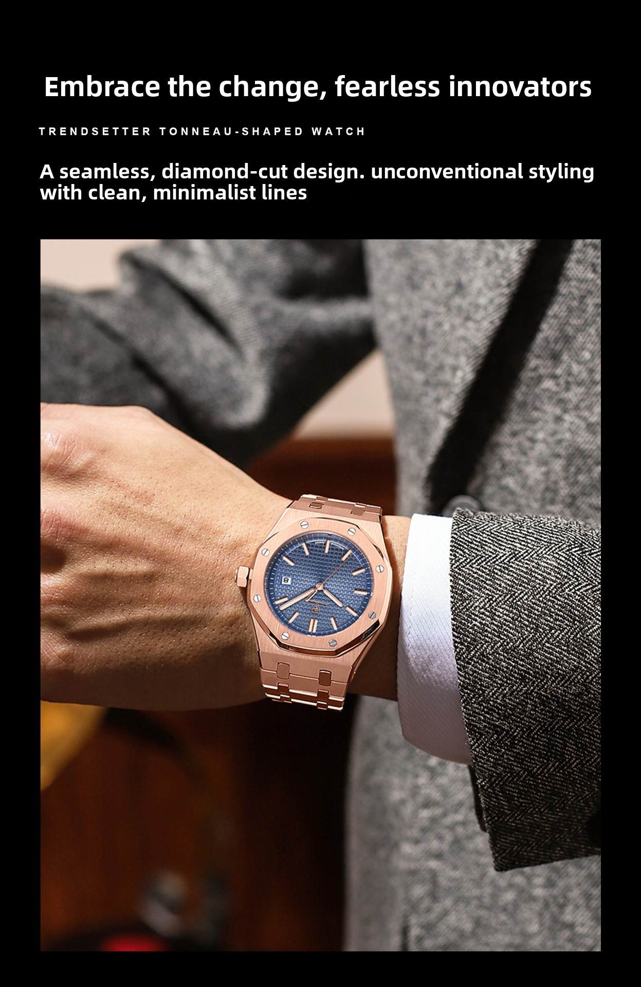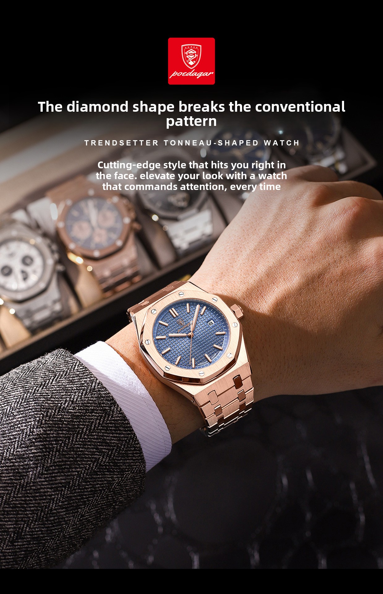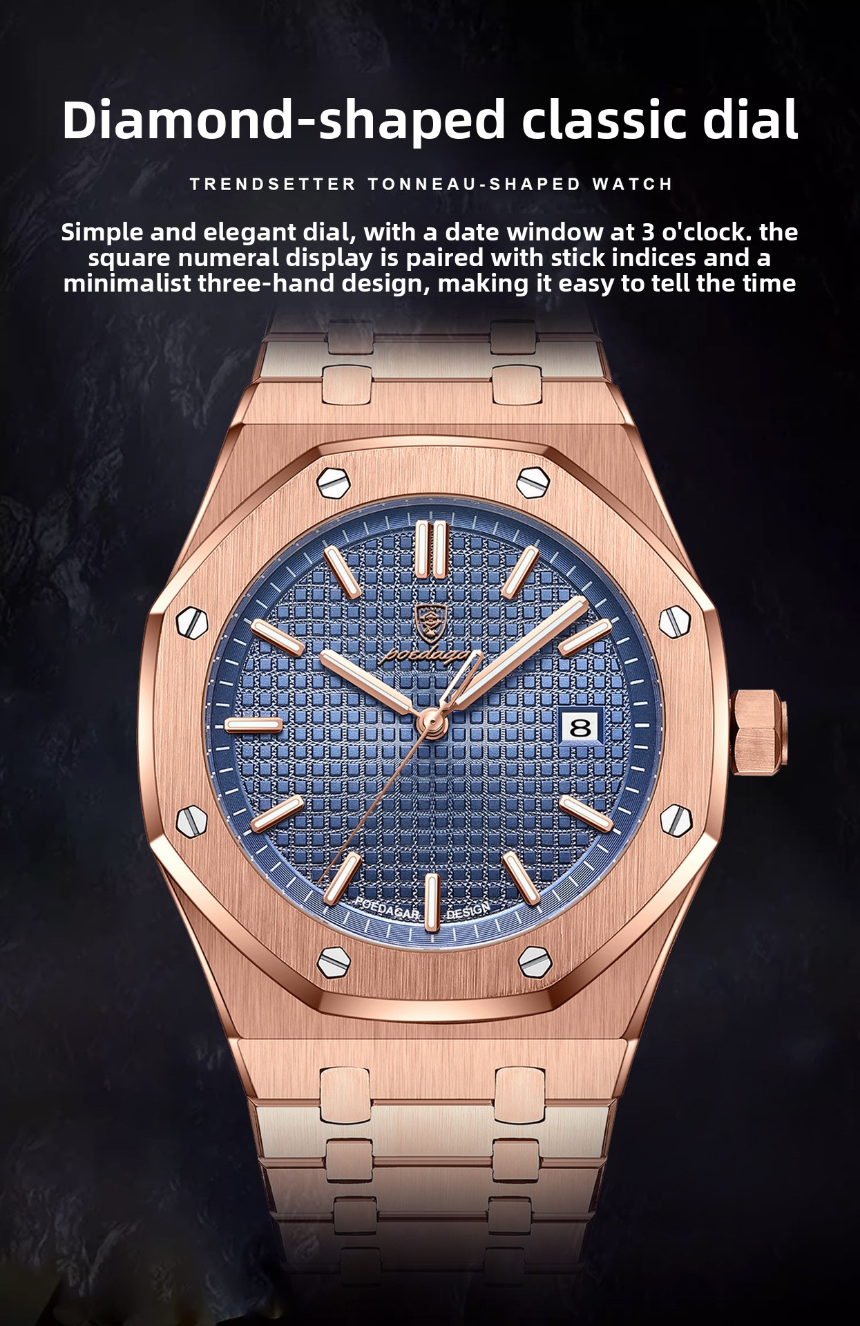 Stylish Design: Fashionable rhombus dial with stainless steel strap.